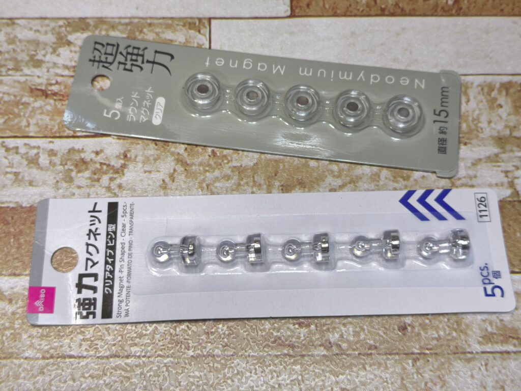 厚みのあるマグネットはダイソーで手に入れることができます。現行品だと下の写真のものが合います。マグネットの厚みはネズミ色のパッケージの物が0.3mm、白いパッケージの物が0.2mm。