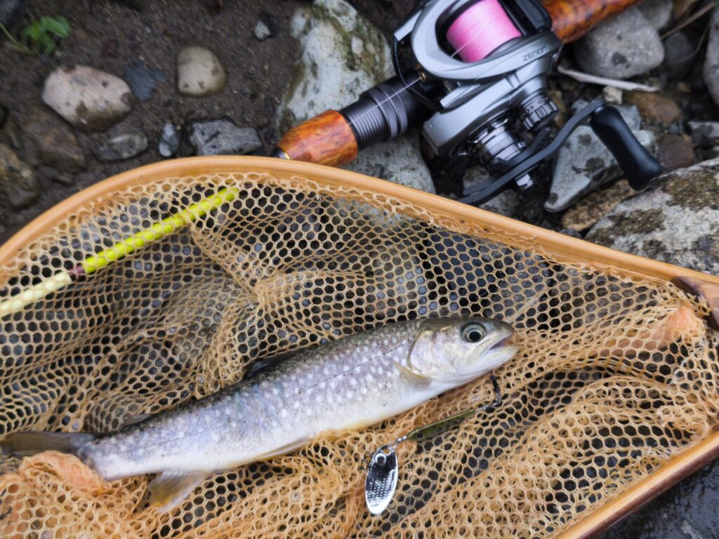 スピナー ニアキス4gでイワナがヒット。イワナを釣ったのは久しぶりな気がします。川釣り自体が久しぶりですが。北海道のトラウトはほとんどスレてないのでかなりの割合でスピナーでのヒット率が高いです。本当はスプーンを使いたいんですけどね。