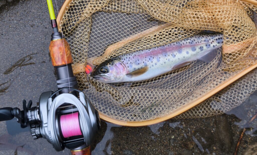 MgBFスプールの可変パーツをスプールから外した状態でセッティングしてトラウトをやってきました。ヒグマが怖くて渓流まで行くのが嫌なので、整備された里川ぐらいの場所でやってます。