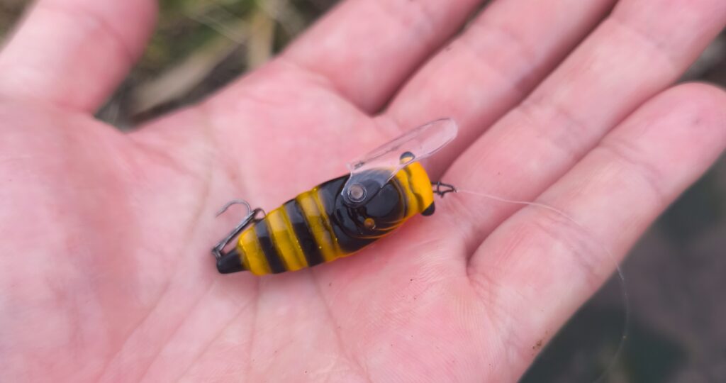 水面がパシャン、となったのを見て「マジか!?」と思いました。なんてたってこのルアーで魚が掛かったのは初めてなのだ。しかし、2.6gのフローティングルアーをベイトリールでキャストするのはなかなか厳しいですね。そして、この1試合で美蝉の羽が片方どっか行きました。